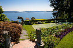 Gated in-city waterfront estate with sweeping water and mountain views, 1.19 acres of lovely grounds and 90+/- waterfront feet w/ 75' covered dock. Meticulously maintained 1933 Tudor with elegant formals, den, kitchen/ family room, 5 bedrooms, 3+ baths, rec room/kitchen, terrace, pool, cabana and sports court. Tram to waterfront guest house w/1,010 SF including living room, kitchen, bedroom, fireplace, bath, and terrace. Outdoor shower and wide lawn with fire-pit.